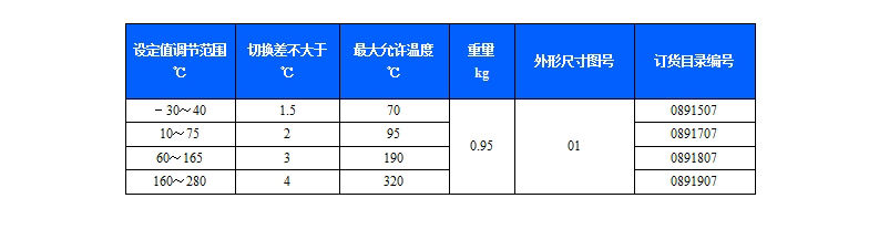 541/7TK溫度控制器采用帶毛細管溫包式傳感器,可用于流動的中性氣體和液體介質(zhì),如果介質(zhì)為腐蝕性,安裝時可選用不銹鋼溫包保護套套在銅質(zhì)溫包外(見附件)。541/7TK溫度控制器的設定值可調(diào),調(diào)節(jié)范圍-30~280℃。